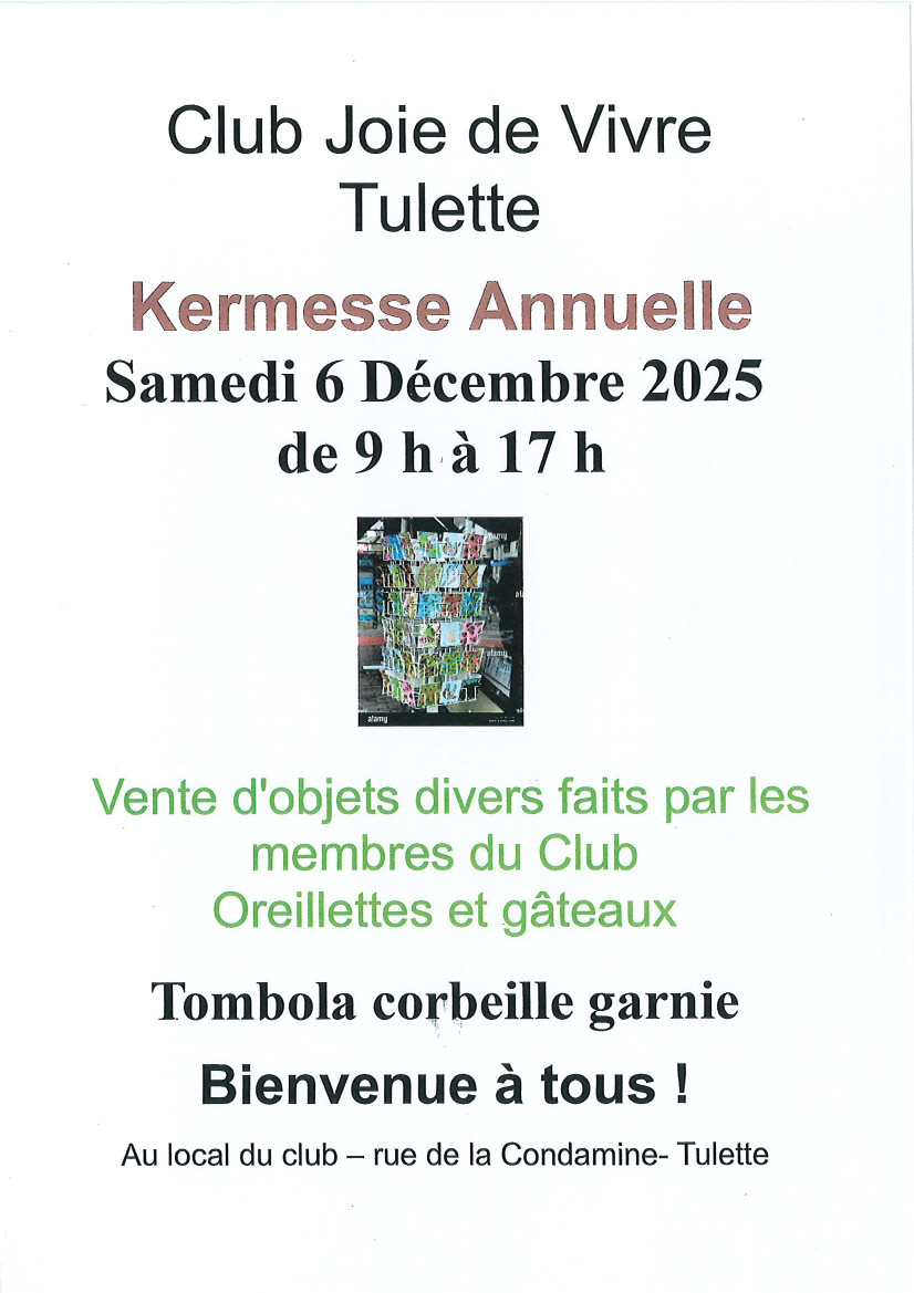 Vous êtes ici : Accueil > Kermesse annuelle du club JOIE DE VIVRE : le 6 décembre de 9h à 17h