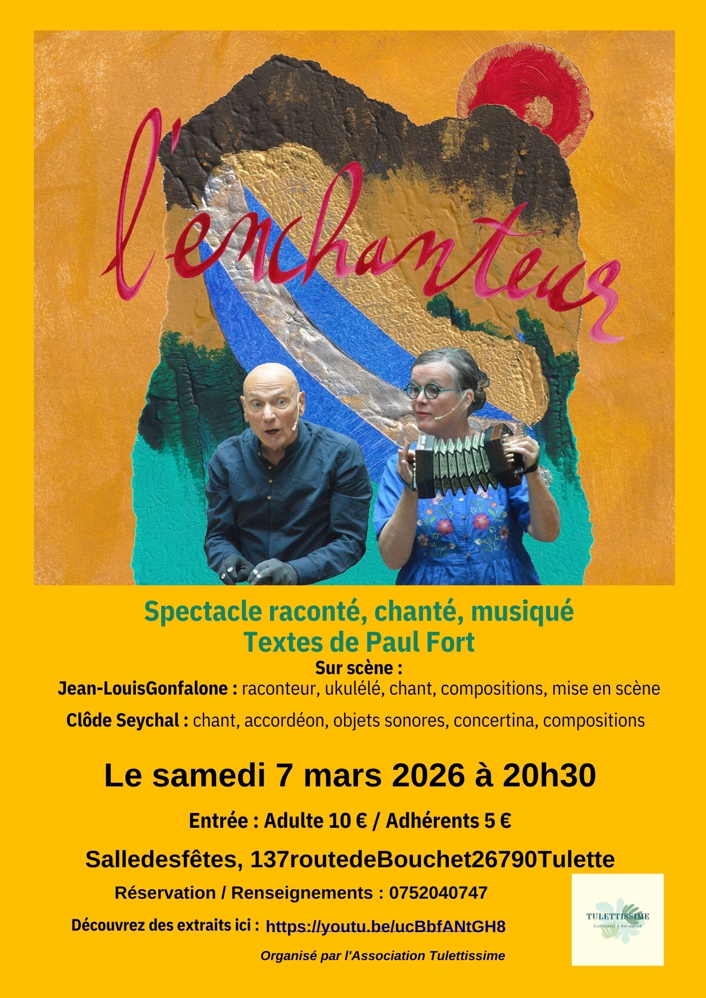 Un spectacle très musical autour de textes de l’œuvre fantasque et singulière du poète Paul Fort, dans lequel les textes, poésies ou véritables histoires en prose sont contés dans un profond respect de l'écriture du poète. Avec Jean-Louis Gonfalone, raconteur, ukulélé, compositions et mise en scène, et Clôde Seychal, chant, objets sonores, concertina, accordéon et compositions.