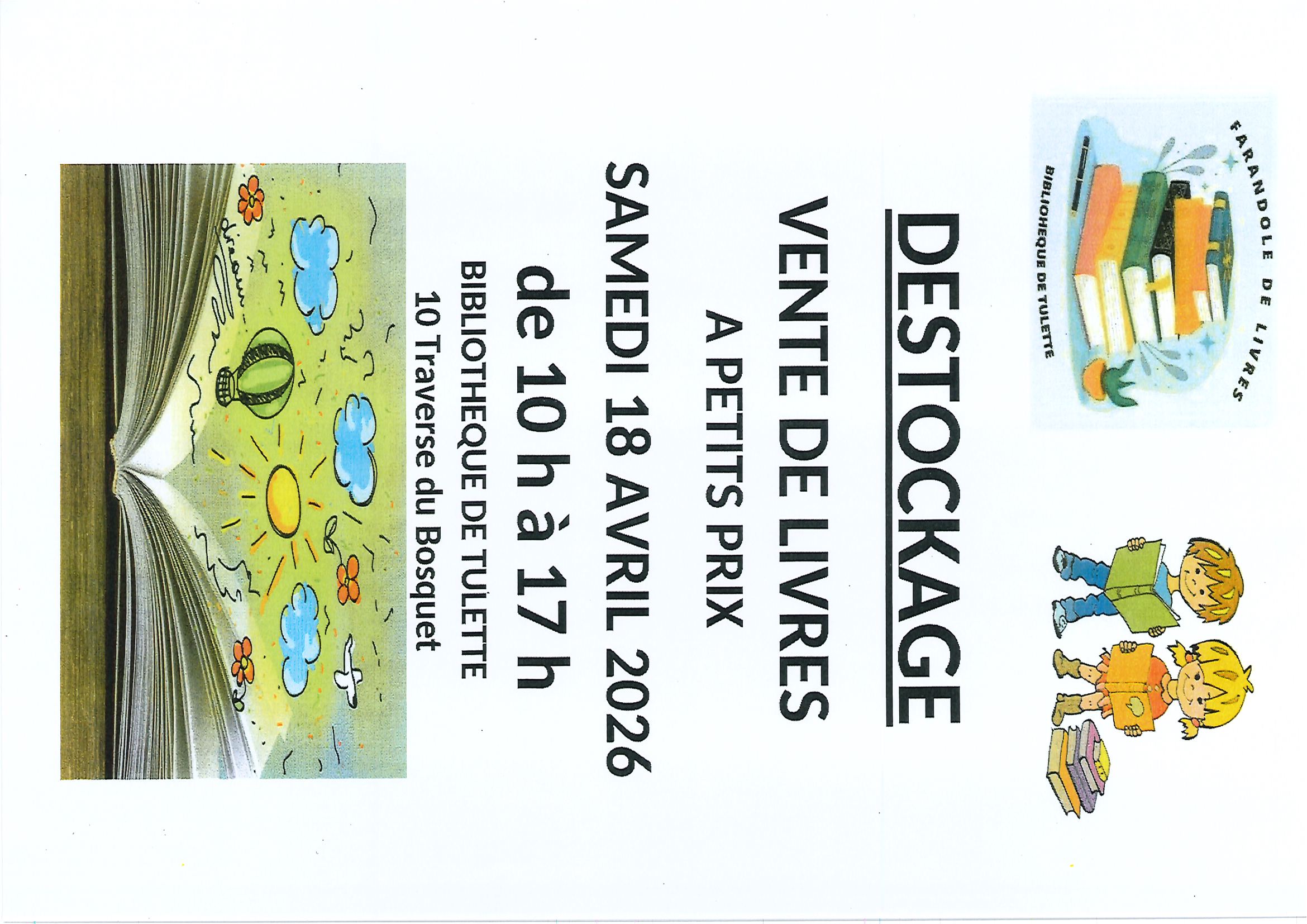 DESTOCKAGE Vente de livres à petits prix Samedi 18 Avril 2026 de 10H à 17H Biliothèque de Tulette